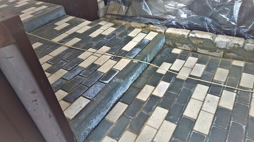 Здравствуйте. В этой статье я вам покажу как обычный (а может и не обычный) дождик может испортить внешний вид всей работы. На этом объекте мы облицовывали бетонные ступени брусчаткой. Хорошо, что заказчик прислушался к совету, и отказался от керамогранита, который почему всем хочется укладывать его на улице. Первым делом выставили бордюры. Нивелир в этом случае особенно необходим, благодаря ему можно сразу вычислить точную высоту ступеней, наверное, уместнее называть их площадками, но пусть будут ступенями...