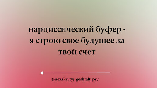 Нарциссический буфер - это период, когда нарцисс решил отложить свой основной ресурс в погоне за другим ресурсом, или когда нарцисс, напитанный энергией, придумал себе великое будущее, забыв обозначить в нем место для своего партнера в принципе. Нарциссический буфер может происходить как один раз, перед самим разрывом, так и циклами, опять же в зависимости от потребностей нарцисса. Это очень похоже на "отложу свою любимую игрушку в сторону, она мне пока неинтересна, у меня есть более интересная игрушка или перспектива получить целую коробку новых игрушек...