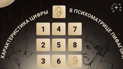 Цифра 9 является символом ума, памяти и ясновидения. Когда в психоматрице наблюдаются три или более девятки, это может свидетельствовать о наличии ясновидения, так как указывает на высокий уровень памяти. Память "9" Отсутствие девятки в расчетах психоматрицы Пифагора рассматривается как невозможный случай, данная цифра должна быть создана линиями, так как человеку необходимо для нормального существования хоть какая-то память. Некоторые люди могут иметь только одну цифру девять. Это связано с их забывчивостью и неспособностью долго держать зло на другого человека...