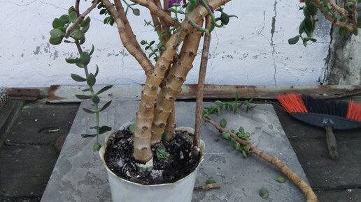В руки мне попало вот такое денежное дерево. Несмотря на внушительные размеры, ветки слишком вытянуты, на стволах много воздушных корней. А ветки и листья ломались и осыпались при малейшем прикосновении. Наглядное фото как делать не надо. Растение очень долго сидело в чистой земле. Настолько долго, что земля стала похожа на пластилин, а солевых отложений хватит целому микрорайону Питера. Земляной ком уже походил на глиняное болото и начал покрываться толи мхом, толи водорослями. Что мы видим после очистки от земли? А ничего мы не видим...