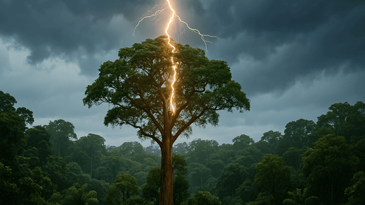 Когда в тропическом лесу сверкает молния, первым под удар попадает дерево. Но почему именно оно? И как так получается, что для некоторых из них это — не катастрофа, а шанс разрастись и усилить свои позиции? Недавние исследования в Панаме показали: отдельные виды деревьев, например диптерикс или тонка-бобы, развили удивительные особенности, которые помогают им не только переживать удары молний, но и выигрывать от них. Вот такие зелёные супергерои, которые обуздали стихи. Высота — главный фактор, привлекающий молнии к деревьям...