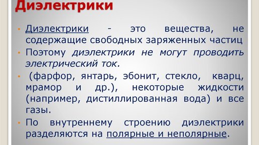 Диэлектрик Вещество плохо проводящее электрический ток, или вообще не проводящее его. Диэле́ктрик (изолятор) (от др.-греч. διά «через; раздельно», и др.-греч. ἤλεκτρον — «янтарь») — вещество (материал), относительно плохо проводящее электрический ток. Электрические свойства диэлектриков определяются их способностью к поляризации во внешнем электрическом поле. Термин введён в науку английским физиком М. Фарадеем. Схема конденсатора с параллельными пластинами с диэлектриком. Две пластины с площадью{\displaystyle A} находятся на расстоянии{\displaystyle d} ...