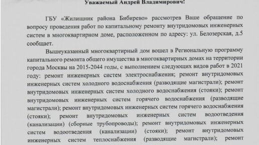 Правозащитник Бабушкин4 года назадПодписатьсяОтвет ГБУ "Жилищник района Бибирево" по кап ремонту в доме 5 по ул.Белозерская