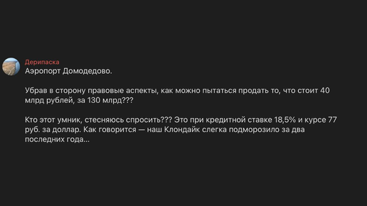 Бизнесмен и основатель ПГ «Базовый Элемент» Олег Дерипаска заявил, что не понимает, почему «Домодедово» стоит так дорого — 132 млрд