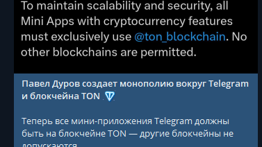 Теперь все мини-приложения Telegram должны быть на блокчейне #TON — другие блокчейны не допускаются. Как все знают, Дуров всегда критикует Apple за монополию на рынке приложений, но теперь он делает также в Telegram - технологическая и финансовая монополизация. Вот основные положения .... С таким заголовком вышли бы желтые газетенки еще лет 20 назад, но сейчас на их месте телеграмм каналы с паникерами и хайпующими на заголовках админами. Но мы живем в 21 веке, когда только формируется крипто-пространство и где президенты запускают мемы, а главный крипто - кардинал Маск создает D...