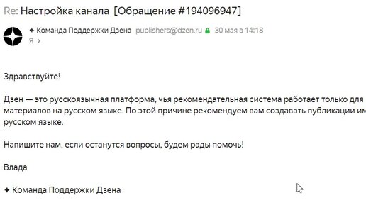 Меня вот тут недавно заинтересовал вопрос следующего плана: "А можно ли вести канал Дзен на английском языке?" Не то чтоб я знала английский или планировала освещать англоязычный быт или новости, но просто стало интересно. Этот вопрос меня изводил несколько дней, я прошарила правила Дзена, все поисковые системы и в конце концом решила задать вопрос поддержке Дзена. Ответ был следующим: Здравствуйте!