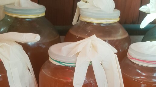 Начало статьи в прошлой публикации Наше сусло бродило 5 дней. Ежедневно утром и вечером мы снимали с него жмых который поднимался наверх, делали это исключительно деревянной ложкой. На 6 сутки наше вино уже гуляло во всю, и мы решили что пора его процедить, добавить сахар и поставить догуливать в стеклянные банки. Процедили с помощью марли, несколько раз переливая наше вино из одной тары в другую, после чего разлили его по стеклянным банкам У нас яблоки очень вкуусные и сладкие, поэтому я добавила на 3-х литровую банку 400 грамм сахара...