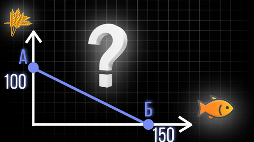 Больше полезной информации можно найти в нашем телеграмм канале Давайте разберем на примере что такое граница производственных возможностей. Представьте, что мы находимся в стране, в которой производят два вида товара: пшеницу и рыбу. Покажем это на графике. Отложим на оси Y то количества пшеницы, которое произведут жители страны, если они потратят на его производство все свои свободные ресурсы. Допустим это 100 единиц товара. Назовем это точкой А...