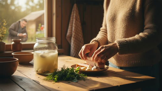 Пахнет чесноком, доска чуть влажная от холодной воды, стеклянная банка стукнула о стол, как колокол по делу. Я всегда начинаю засолку в рассоле ранним вечером, когда в доме уже тихо и не торопишься. Руки помнят движения: проверила шкурку ногтем, протёрла кусок чистым полотенцем, ножом сняла случайный мусор у края. На плите греется вода для рассола, не до кипения, просто чтобы соль быстрее разошлась, а рядом лежит лавровый лист, горошины чёрного перца и чеснок, который мы сажали весной вдоль забора...