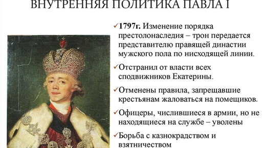 Едва взойдя на престол, Павел 1 изменил порядок престолонаследия в России, который без изменений действовал еще со времен Петра Великого. Отныне права на престол имели только представители правящей династии по мужской линии в порядке старшинства. Так началась внутренняя политика императора Павла 1. Следующим этапом действий Павла 1 внутри страны стали поиски сподвижников и завоевания любви и уважения большей части народа. Для достижения этих целей Павел 1 практически полностью отстранил от власти всех чиновников, которые служили императрице Екатерине II...