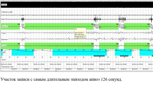 Большинство людей не могут задерживать дыхание более чем на минуту. Дальше возникает такая жажда вдоха, которой противостоять невозможно. Меня удивил мой пациент, который без всякой подготовки остановил дыхание на 2 минуты. Правда, было это во сне, и помимо его желания (см иллюстрацию - длительность паузы подписана в секундах). Я занимаюсь проблемой апноэ сна много лет, но таких длительных задержек дыхания не встречал — обычно дыхание во время сна восстанавливается уже спустя 30-60 секунд. Дальше следуют один за другим несколько шумных вдохов с храпом, и пауза может возобновиться...