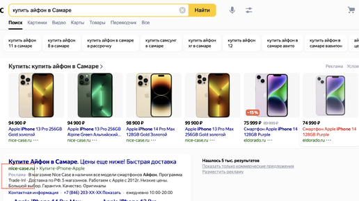 Яндекс - к сожалению, одна из популярных поисковых систем в России. Да, я сожалею об этом - т.к. сотрудники не добросовестно выполняют свою работу. Я работаю с Яндексом с 2014 года. Именно с этого времени я слежу за изменениями и новшествами в поиске - как происходит простыми словами, захват поисковой выдачи. Хочется выговориться и получить обратную связь - уверена, что я не одна такая 😜 1. Давайте посмотрим для начала - как на сегодняшний день выглядит поисковая выдача? Введем простой запрос - купить айфон в Самаре, смотрите скриншоты, все понятно...