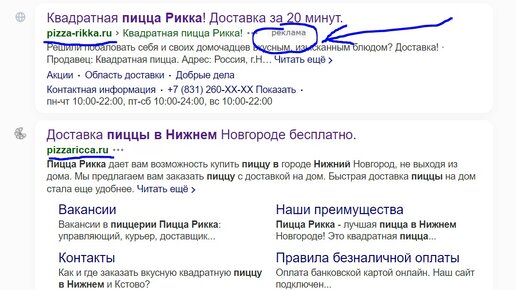 Короткий пост, однако очень полезный, если вы доверяете рекламе от Яндекса. Я зашел в поиск яндекс выйти на сайт, где я обычно заказываю пиццу, их ссылка была и остаётся pizzaricca.ru . За рекламу мне от них никто не платил, просто постоянно там покупаю, зарекомендовали себя. Зайдя и введя искомый запрос я получил несколько вариантов: Настоящий сайт оказался на втором месте в поиске, а на первом - какой-то левый, с ссылкой, которую я вижу впервые и с пометкой "реклама". Я решил перейти по первому сайту и посмотреть, что это такое...