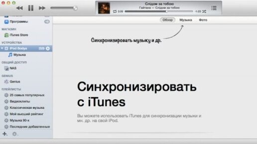 Синхронизация содержимого iPod с iTunes Подключите устройство через шнур USB к ПК. Запустите программу iTunes (если она не скачана, то лучше всего это сделать через официальный сайт Apple. После этого компьютер автоматически распознает гаджет)...