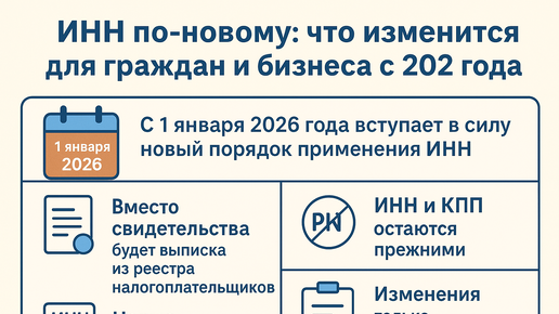 📅 С 1 января 2026 года в России вступает в силу новый порядок присвоения и применения ИНН (идентификационного номера налогоплательщика). Это не просто техническое обновление — изменения затрагивают всех: и обычных граждан, и предпринимателей, и организации. Многие уже слышали, что «ИНН станет другим», «будет 20 цифр» или «заменят свидетельства». Давайте разберёмся подробно и простым языком — что действительно изменится, зачем это нужно и что делать каждому налогоплательщику. ИНН — это индивидуальный номер, который налоговая служба присваивает каждому человеку и организации...