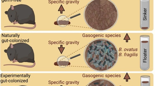 Долгие годы считалось, что кал остаётся на плаву благодаря жирам в его составе. Последнее исследование полностью опровергло эту теорию. • У стерильных грызунов кал всегда тонет, но стоит добавить в их кишечник бактерии – и у половины мышей «результат» начинает всплывать...