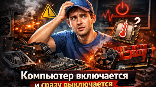 Если компьютер включается и сразу выключается, проблема может быть как простой (пыль или плохой контакт), так и серьёзной (неисправность блока питания или материнской платы). Важно правильно определить симптом: Правильная диагностика экономит время и деньги. Компьютер выключается после сборки, апгрейда или чистки В этом случае чаще всего проблема связана с подключением или совместимостью. 🔌 Проверка питания процессора Убедитесь, что подключён 4/8-pin кабель питания CPU (обычно в верхней части материнской платы)...