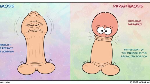 Много раз говорили с вами о том, что такое фимоз. Напомню, фимоз - патологическое состояние, при котором невозможно вывести головку полового члена за пределы крайней плоти. Так вот, парафимоз - это не фимоз у нескольких детей одновременно, как может показаться на первый взгляд. 📌Парафимоз - состояние, когда головку за пределы крайней плоти вывели, а назад закрыть крайнюю плоть не получается. Короче говоря, вывели, а дальше - ой ой ой! Что делать то теперь?🫢 Причин возникновения такой штуки может быть несколько: 1️⃣Баловался - вывел сам, сказать постеснялся...