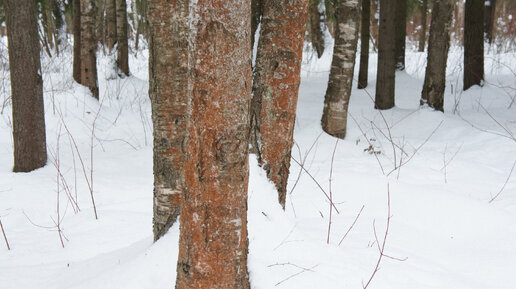 Почему деревья красные? Странный цвет берёзовых стволов в зимнем лесу