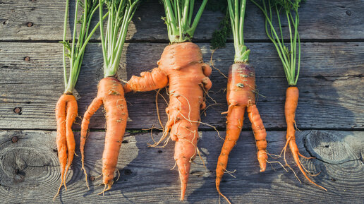 Думаю нет такого огородника, который не сталкивался с тем, что довольно много моркови начинает ветвиться, вырастает кривой и может сильно повеселить нас своими формами во время сбора урожая. Но вот храниться такая морковка долго не будет, да и чистить её неудобно, приходится обрезать много лишнего, хотя на вкус она ничем не отличается от ровной моркови. Почему морковь вырастает кривой? Причин такого ветвления моркови может быть несколько и сейчас я расскажу вам самые основные, которые сильно влияют на форму моркови...
