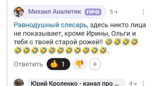 Непонятный и глупый комментарий Юрца! Слесарь написал, что я скрываю свое лицо. Я ответил, что почти никто не выкладывает здесь свои фото. И тут Юрец написал, что это мои проблемы, что я не сидел его фото, то есть фото Юрца. С какого хрена Юрец нафантазировал, что мне нужно его фото? Гагагага!!! 😁😁😁😁😁😁😁😁😁😁...