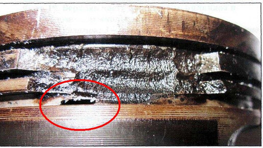 Симптомы: На днище поршня, на жаровом поясе и на боковых поверхностях канавок видны следы эрозии. Разрушение перемычек поршневых колец может происходить сверху вниз или снизу вверх. Причины: ***Нарушение процесса сгорания топлива:*детонационное сгорание может происходить из-за раннего зажигания, слишком бедной воздушно-топливной смеси, использования топлива с низким октановым числом и других причин. Монтажные ошибки: неправильная установка поршневых колец может привести к их частичному выпиранию из канавки и заклиниванию на передней стороне отверстия...