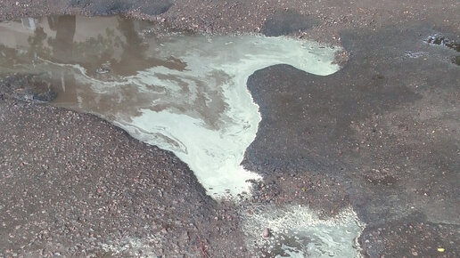 Вчера вечером и ночью шел мелкий дождик. Сегодня с утра вышли, уже почти высохло. Но вокруг луж, особенно где соприкосновение с землёй, желто-зеленые разводы, а в самих лужах не всех, но многих, словно разлитое масло хлопьями. Сперва подумала, что из под машин, но потом увидела ещё и ещё. Похожее уже было, когда пепел с Камчатки принес осадки...