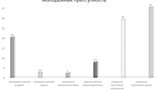 Молодёжная преступность. Почему же поколение младшего возраста решается на совершение противоправных деяний? Этот вопрос интересует многих, однако на данным историческом этапе это не просто интерес, а настоящая глобальная проблема современности. Чтобы узнать об истинных мотивах преступлений молодых, была создана исследовательская работа, которую можно прочитать ниже: Именно такие данные были выведены в процентном соотношении с помощью опросника среди граждан 12-25 лет. Уже на первых этапах рассмотрения...