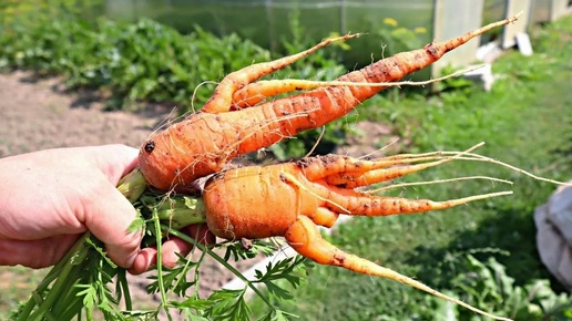 Неидеальная форма моркови — распространённая проблема, с которой сталкиваются многие огородники. Разберёмся, какие факторы чаще всего приводят к деформации корнеплодов и как этого избежать. 1. Слишком густые всходы. Одна из самых частых причин искривления моркови — загущённые посевы. Когда растения расположены слишком близко друг к другу, корнеплодам не хватает пространства для правильного роста: они начинают изгибаться, упираться друг в друга и принимать причудливые формы. Что делать: своевременно прореживайте всходы...