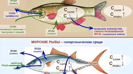 Морские рыбы приспособлены к жизни в среде с определенной соленостью. Пресная вода содержит гораздо меньше солей, чем их естественная среда обитания. При помещении в пресную воду растворенные соли, на которые рыбы полагаются при осмосе, разбавляются, что приводит к быстрому перемещению воды в их клетки, что приводит к обезвоживанию и смерти. Для того чтобы выжить, морские виды должны жить в среде, где концентрация солей достаточно схожа, чтобы ее можно было поддерживать, уравновешивая количество воды, поступающей в организм и покидающей его через осмос...