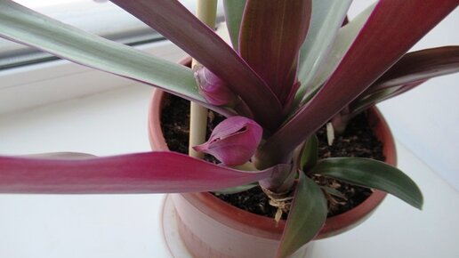 Традесканция Рэо имеет очень декоративные листья, с нижней стороны они фиолетовые. И цветет растение интересно, мелкие беленькие цветочки находятся словно между двух покрывал, как бы в лодочке. Поэтому растение и называют еще ладья Моисея. Традесканция покрывальчатая это еще одно название цветка из - за особенностей цветения. Цвести традесканция Рэо может в любое время года, но чаще всего летом. Единственное, что мне не нравится в цветке, это хрупкость листьев. Стоит случайно задеть листок, и все, он испорчен...