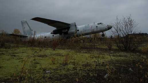 Самолет Ан-26 стоит посреди заброшенного аэродрома. Забрался в кабину пилотов