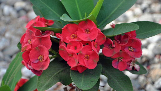 Это самый прекрасный, колючий представитель семейства Молочайные. Аристократический вид эуфорбии Миля соответствует названию, ведь его величают в честь барона Пьера Б. Миля. Особое обаяние придает цветение, а длится оно почти круглый год. Настоящим украшением являются яркие, прицветные листья, а сами цветки невзрачные, как у всех молочайных. Самое главное в содержании растения – своевременная обрезка ветвей и формовка кроны. Это позволяет не только удерживать его в нужных размерах, но и стимулировать цветение...