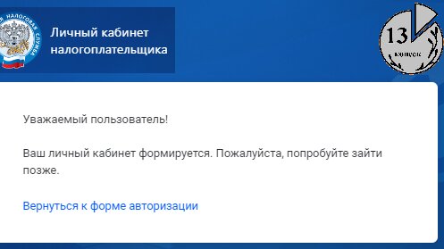 Сколько по времени будет отображаться ошибка «Уважаемый пользователь! Ваш личный кабинет формируется. Пожалуйста, попробуйте зайти позже.» И дальше идёт ссылка «Вернуться к форме авторизации». Обычно формирование личного кабинета налогоплательщика занимает от пары часов до суток. Если формировать личный кабинет начали в период технических работ (их обычно проводят в субботу и воскресенье), то срок формирования будет отложен до окончания технических работ (то есть до понедельника). Максимальный срок,...