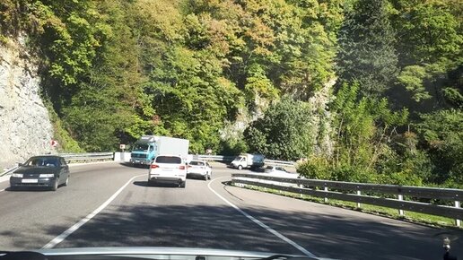Дорога от Джубги до Сочи всего одна, и если до Туапсе ехать ещё более - менее нормально, то после начинаются сплошные перевалы. Вверх, вниз, вправо, влево и все это со скоростью велосипедиста, не более 20-40 км в час. Расстояние 113 километров и по прямой дороге тут езды чуть более часа. По карте показывает около двух часов. Мы же ехали в одну сторону 4 часа, в обратно все пять. Это ещё без пробок в межсезонье. Это одна из причин, по которой ехать на машине в сторону Сочи больше нет желания. Дорога очень утомительная и укачивает сильно...