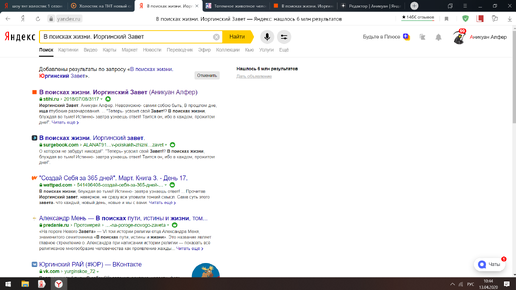 Есть у меня ни одна статья в яндекс дзен. И чтобы максимально ограничить поиск моей статьи, так как я являюсь новичком и горю желанием- продвигать свой необычный канал, выбрал авторскую статью "В поисках жизни. Иоргинский завет". Так как яндекс браузер является поисковой системой. А также в нем разработана сама платформа яндекс дзен, то, по логике, моя статья должна высветиться. Но, как вы видите, среди доступных сайтов со схожими названиями, где я опубликовывал свою авторскую статью- НЕТ. Это о...