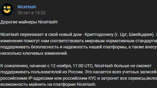 12 ноября 2024 года популярная платформа для майнинга NiceHash заблокирует всех российских майнеров. Это означает, что все российские майнеры, использовавшие NiceHash для заработка на своей видеокарте, процессоре или ASIC-майнере, больше не смогут пользоваться сервисом. Успевайте переключить мощности до 12 ноября чтобы не потерять доход на простое оборудования! Причины блокировки: Точные причины такого решения NiceHash пока не озвучены официально. Однако, можно предположить, что это связано с геополитической ситуацией и ужесточением санкций против России...