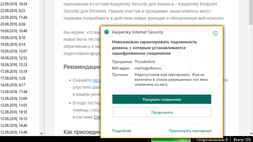 Пользователи Kaspersky Internet Security часто могут это видеть сообщение в нижнем правом углу экране. В некоторых случаях стоит задуматься, стоит ли продолжать соединение (если Вы пытаетесь зайти на неизвестный веб-сайт), но в некоторых его следует игнорировать: если у Вас личный домен почты (@*...