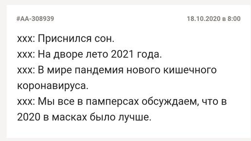 Всем привет. Хочется в связи с новым штампом одного вируса поговорить о том, над чем нельзя прикалываться. Нельзя прикалываться над смертью, над болезнями, нам собствееным неблагополучием, ведь, вселенной все равно, пошутил человек, или нет. Она все записывает со словами "Слушаю и повенуюсь. Примерно, год назад по интернету гулял анекдот, где одному из героев приснился сон, что летом 2021 все будут ходить в памперсах и говорить, что масках было лучше, потом еше "Уральские пельмени" в одном из своих телеконцертов пошутили, что коронавирусу нельзя дружить с диареей...