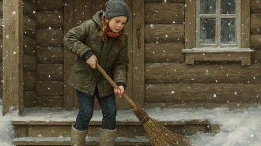 Рассказ День выдался на удивление тёплым, снег беспрерывной пеленой падал с неба, только успевай его счищать. Маруся Маслова обулась в коротко обрезанные валенки и вышла на крыльцо, а там, взяв в руки лопату, принялась сгребать снег, потом остановилась, увидев на ступеньках несколько дырочек в снегу. Такие углубления в снегу она уже видела раньше. Маруся откинула лопатой снег и увидела мелкие блестящие монетки — мелочь. Кто-то подбросил их на крыльцо. Собрав монетки в кулачок, девочка огляделась...