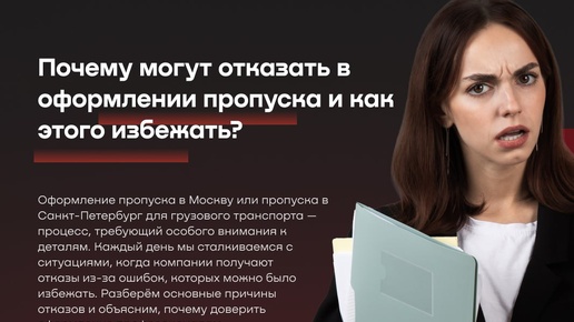 Оформление пропуска в Москву или пропуска в Санкт-Петербург для грузового транспорта — процесс, требующий особого внимания к деталям. Каждый день мы сталкиваемся с ситуациями, когда компании получают отказы из-за ошибок, которых можно было избежать. Разберём основные причины отказов и объясним, почему доверить оформление профессионалам — разумное решение. Самая распространённая проблема — неполный или неправильно оформленный пакет документов. Даже небольшая неточность в ПТС, СТС или договоре лизинга может стать причиной отказа...