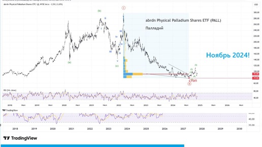 #Commodity #PALL #1D abrdn Physical Palladium Shares ETF (PALL) Палладий Есть вопросы к структуре внутренней волны (3) of [3] of iii, но в целом выглядит как на продолжение роста. Стоп уже можно подтянуть на завершение волны [2]...