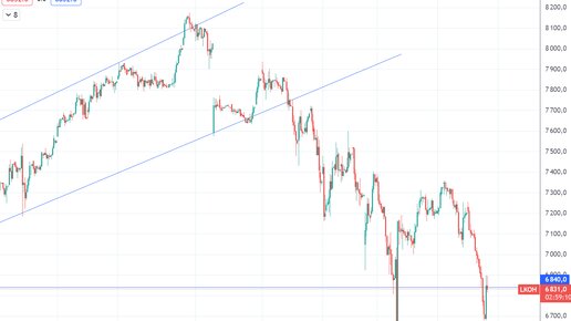 На этой неделе весь рынок акций ускорил падение, а вчера даже удалось пробить ключевые 3000 пунктов по индексу ММВБ. Не отстают от рынка и акции Лукойла, которые падают вместе с рынком. И вчера они так же, как и индекс, подошли к ключевой поддержке, пробой которой может сильно ускорить снижение акций уже в ближайшую неделю. С тех пор, как акции Лукойла вышли из восходящего канала, в котором постепенно росли с февраля, сформировался нисходящий тренд в рамках которого акции падают уже два месяца. На...