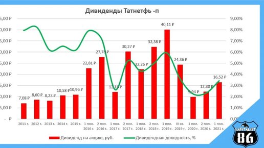 Всем привет! Годовая инфляция в России достигла 6,68% при целевом уровне Центробанка в 4%, так следует из материалов Министерства экономического развития. Я обратил внимание на то, что сейчас народу предлагают вклады свои деньги в банки под 5 - 5,5% годовых, которые даже формальную инфляцию не обгоняют. Я решил продолжить покупать акции себе в портфель. И сегодня очередной актив из моего портфеле, акции компании Татнефть. Компания отчиталась по МСФО за 2 кв. 2021 года: Выручка +128% г/г, чистая прибыль +180%...
