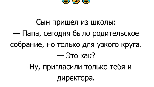 Маленький сын маме: — Мам, а почему папа лысый? — Потому что он очень умный! — А почему у тебя такие длинные волосы? — Ешь суп и замолчи! В ресторане: — Официант, в моем супе плавает муха! — Не переживайте, она просто репетирует заплыв брассом! Разговор двух подруг: — Представляешь, мой муж вчера пришел домой с букетом роз! — Ого, и что ты ему сказала? — «Ну и где мы будем ставить палатку?» Директор школы вызывает отца Вовочки: — Ваш сын вчера разбил окно в кабинете химии! — Ну, хоть где-то он проявил активность! На приеме у окулиста: — Доктор, я стал плохо видеть деньги...