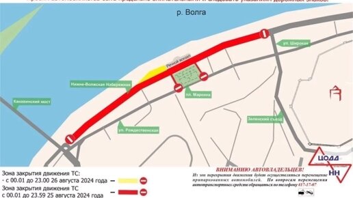 В Нижнем Новгороде 25 августа перекроют Нижневолжскую набережную на участке от Канавинского моста до улицы Широкой и площадь Маркина. Об этом предупреждает городской департамент транспорта и дорожного хозяйства. Из-за этого изменятся маршруты автобусов. А-3, А-61, А-92, Т-70, Т-91 в направлении Ковалихинской улицы пойдут через Похвалинский съезд, улицы Маслякова, Ильинская, Добролюбова, Октябрьская, Варварская. В направлении Канавинского моста – по улице Варварской, площади Минина, улицам Алексеевская, Добролюбова, Ильинская, Малая Покровская и Похвалинскому съезду...
