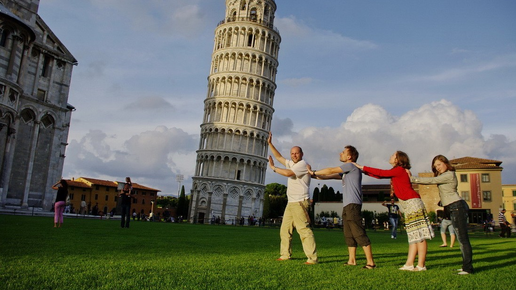 Пизанская башня, белая, мраморная, будто падает на зелёную траву Соборной площади. Все ждут, вот-вот рухнет, а она стоит, качается, как в старой песне, и не падает. Войны, землетрясения пережила, а всё на месте. Почему наклонилась? Упадёт ли? Давайте разберёмся. Белоснежная башня, высотой 56 метров, почти вся из мрамора, только внутри известняк попроще. Не одна она стоит, а с Пизанским собором, баптистерием и кладбищем Кампо-Санто — вместе они в ЮНЕСКО попали. Собор — для Девы Марии, баптистерий — самый большой в Италии, 50 метров вышины, 30 в ширину...
