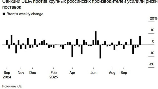 Нефть показывает самый большой недельный прирост с июня Цены на нефть продемонстрировали самый большой недельный прирост с июня после введения санкций США в отношении «Роснефти» и «Лукойла», повысивших вероятность перебоев с поставками и роста спроса на альтернативные сорта. В пятницу цена на нефть Brent составляет более $66 за баррель, повысившись примерно на 7% за неделю, цена на американскую WTI опустилась ниже $62...
