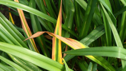 Вот если вы увидели что листья у лилейников пожелтели, нужно сразу проанализировать. Нужно смотреть не только как пожелтели листья, но посмотреть рисунок пожелтевшего листа. Вот это очень важно для того чтобы правильно определить болезнь.