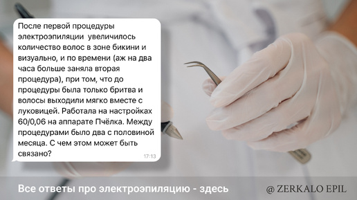 ❓Вопрос: После первой процедуры электроэпиляции увеличилось количество волос в зоне бикини и визуально, и по времени (аж на два часа больше заняла вторая процедура), при том, что до процедуры была только бритва и волосы выходили мягко вместе с луковицей. Работала на настройках 60/0,06 на аппарате Пчёлка. Между процедурами было два с половиной месяца. С чем этом может быть связано? Рубрика “ответы на вопросы” 💬 Ответ: По описанию процедура проходила хорошо и на оптимальных настройках. Возможно несколько...